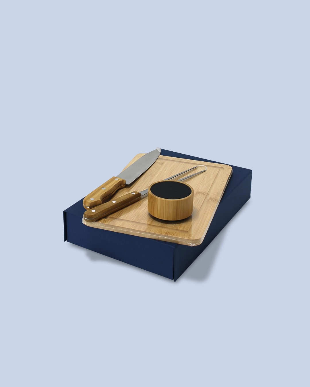 Faca; em aço inox e bambu. Certificação EU Food Grade.